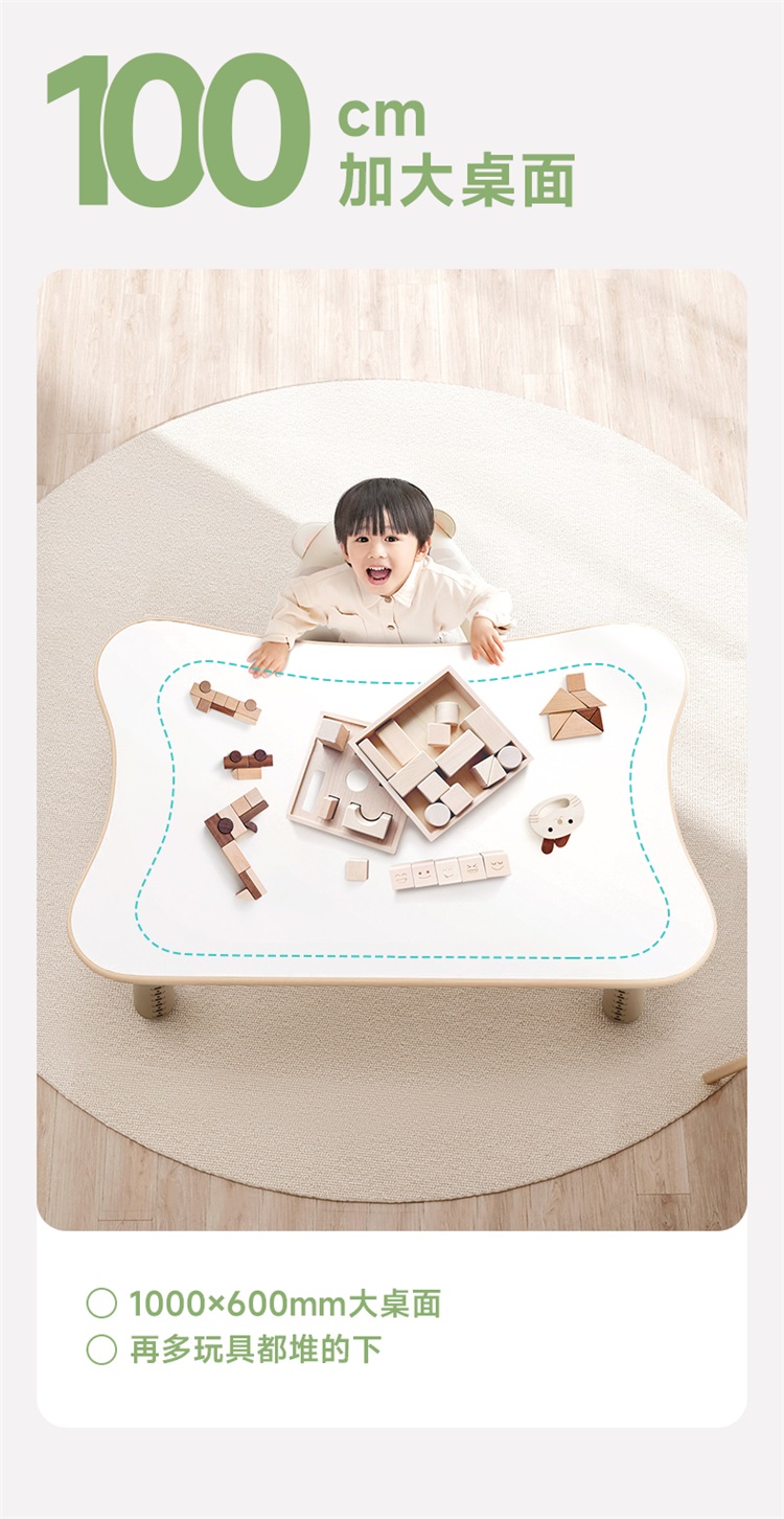 独创月牙形单直边设计,贴心靠墙摆放不浪费空间!1米超大面积,同时容纳餐盘、绘本、玩具,吃饭游戏学习全不误~