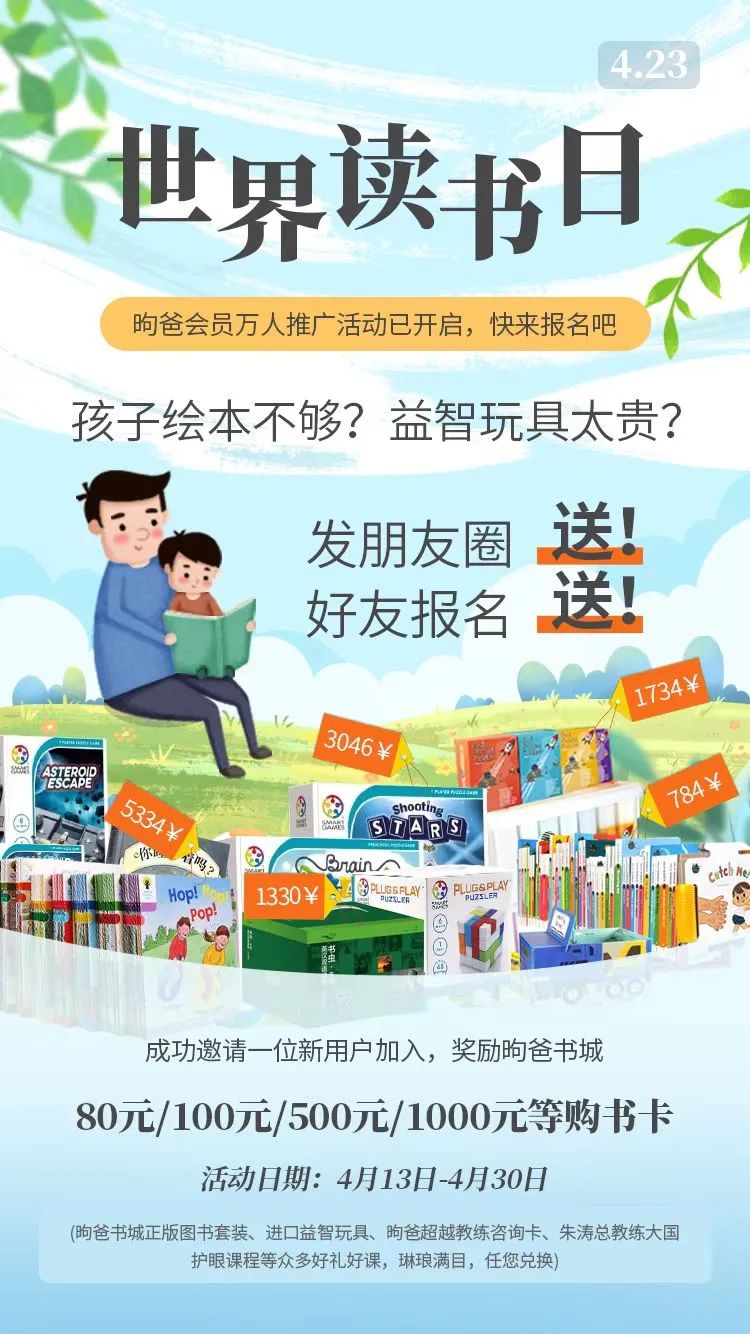 为感谢广大会员朋友一直以来对昫爸教育科技的信赖与支持,值此第28个世界读书日(4.23)来临之际,为回馈广大新老会员,昫爸公司特组织读书节推荐有礼活动,成功邀请一位新会员加入,最高可获得1000元购书卡奖励。