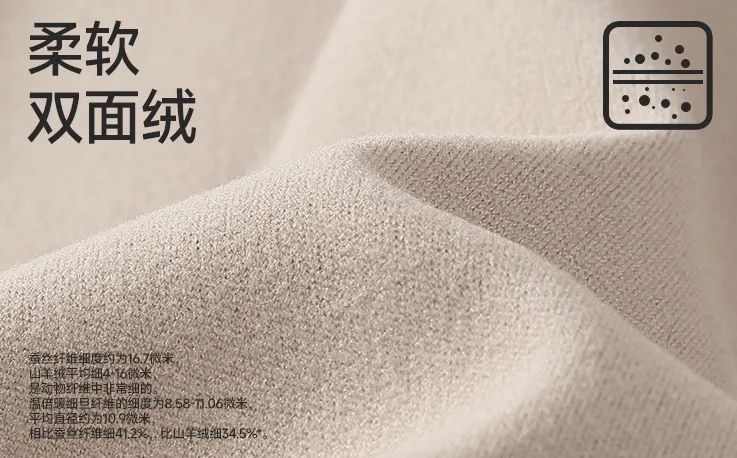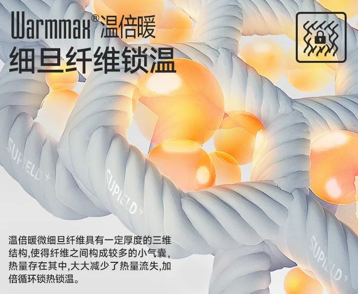 素湃保暖衣用的是温倍暖细旦纤维,比传统纤维细10倍以上,比蚕丝纤维细41.2%,比山羊绒细34.5%,要知道,纤维细度越小,热辐射穿透能力越弱。