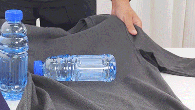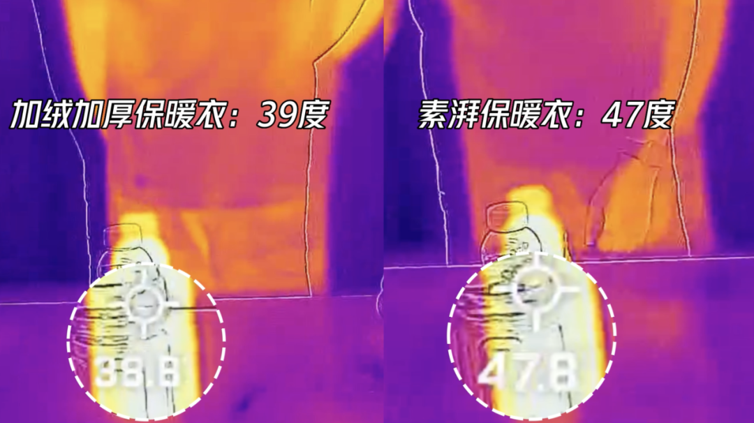 用素湃保暖衣和普通保暖衣分别包住一瓶60℃的热水,3分钟拿出,分别用温感仪检测两瓶水温度变化。