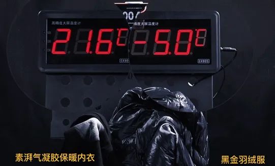 明显看到,黑金羽绒服都降到-5℃,但素湃保暖衣温度还停留在21.6℃,远超黑金羽绒服!
