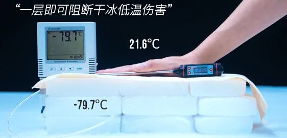 超强御寒:薄薄一层气凝胶铺在零下79.7℃的干冰上,再用温度计测试发现,气凝胶的上面还能维持21.6℃的温度,牛!