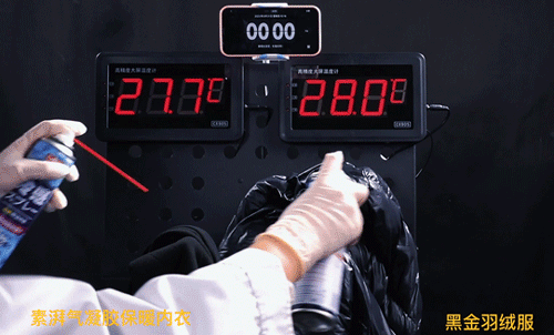 再看下实测:用可以快速降到零下20℃的冷却喷雾同时喷在黑金羽绒服(内含大于90%鸭绒)和我们素湃保暖衣膝盖气凝胶处,观察温度变化。