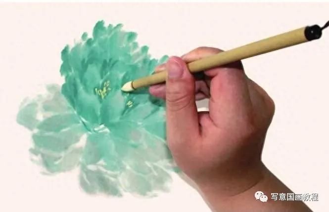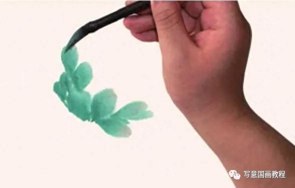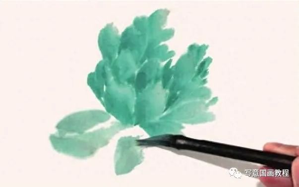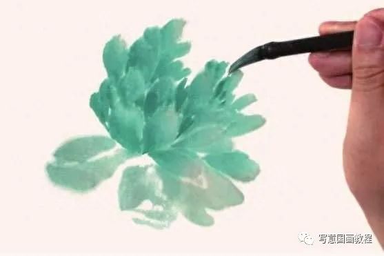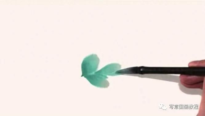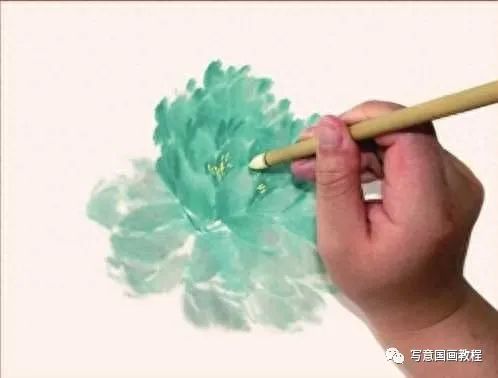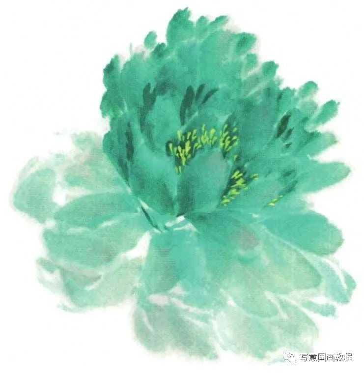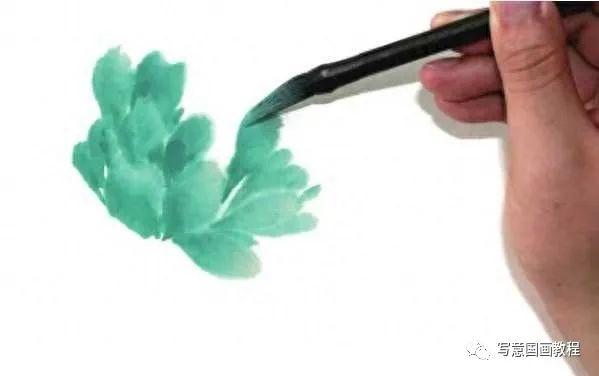 1 落笔轻轻点缀绿牡丹的花瓣,先点出最中间的三片花瓣。