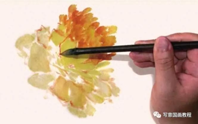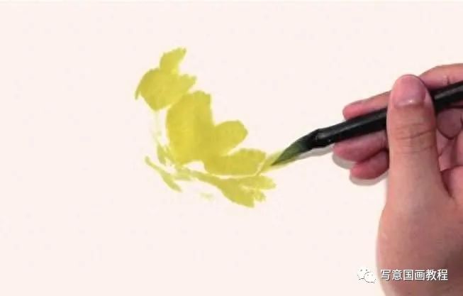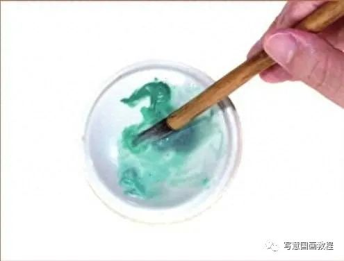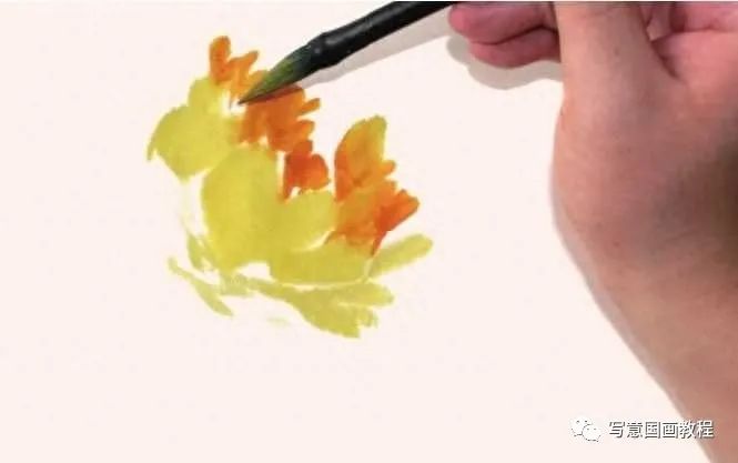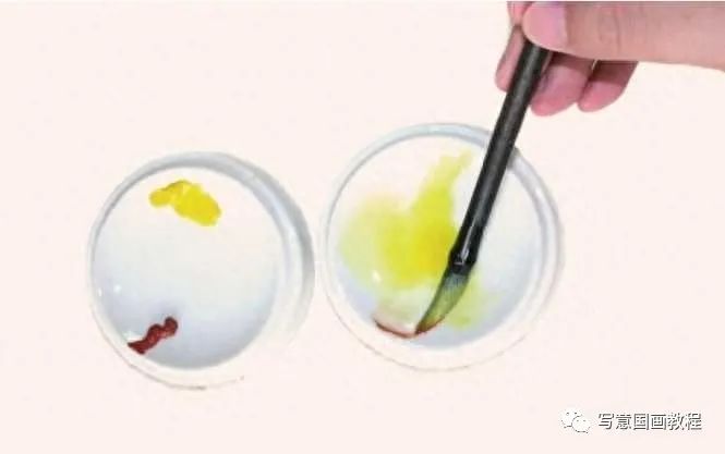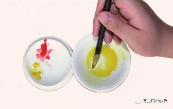 1 先用中号羊毫笔蘸取钛白,然后与少量藤黄调合,笔肚调和饱和,用笔尖蘸朱膘,开始作画。