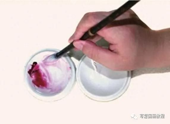 1 用毛笔蘸白粉,浓淡厚度要适中,然后在笔尖上蘸胭脂,开始作画。