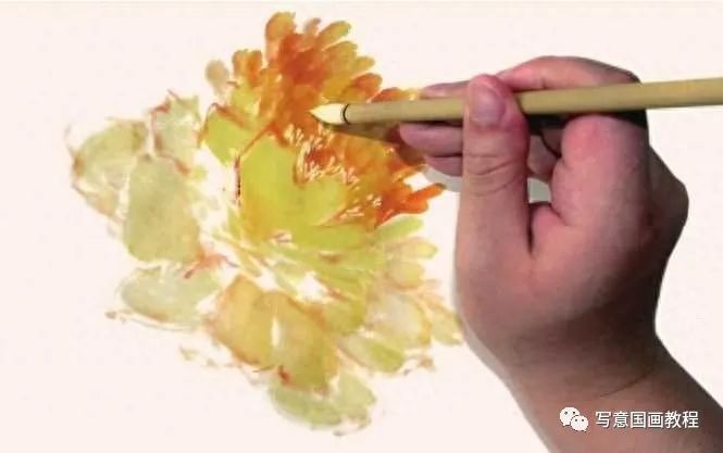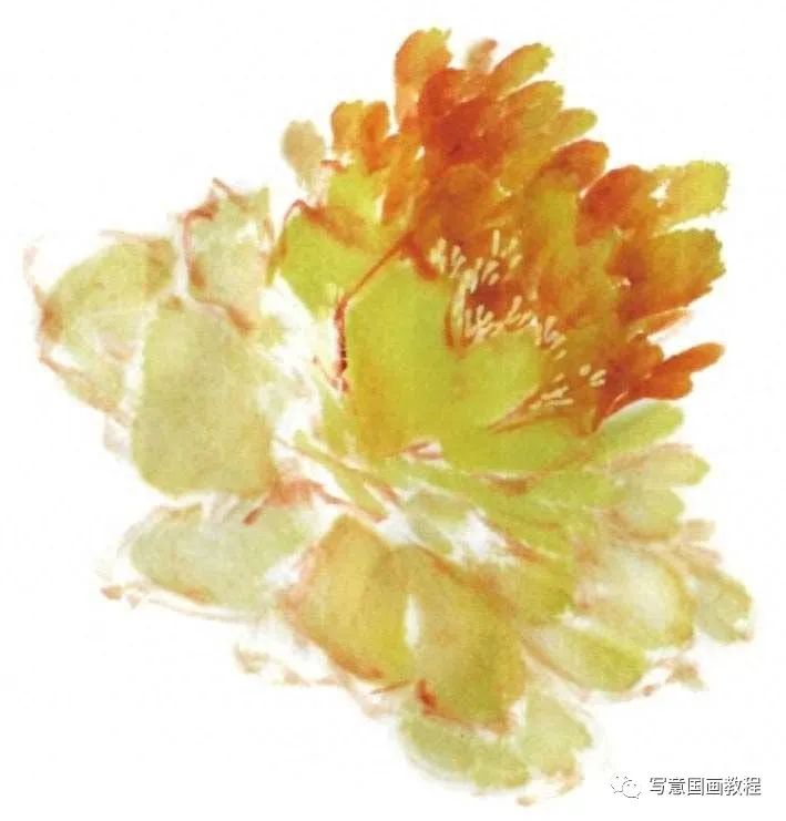 6 依照花头的长势用毛笔蘸朱膘,勾画花瓣的外轮廓。