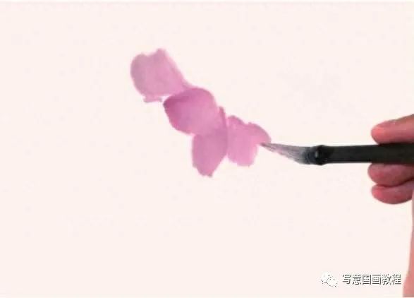 3 用毛笔蘸朱膘,侧锋由左向右捻笔式,画其后侧花瓣。
