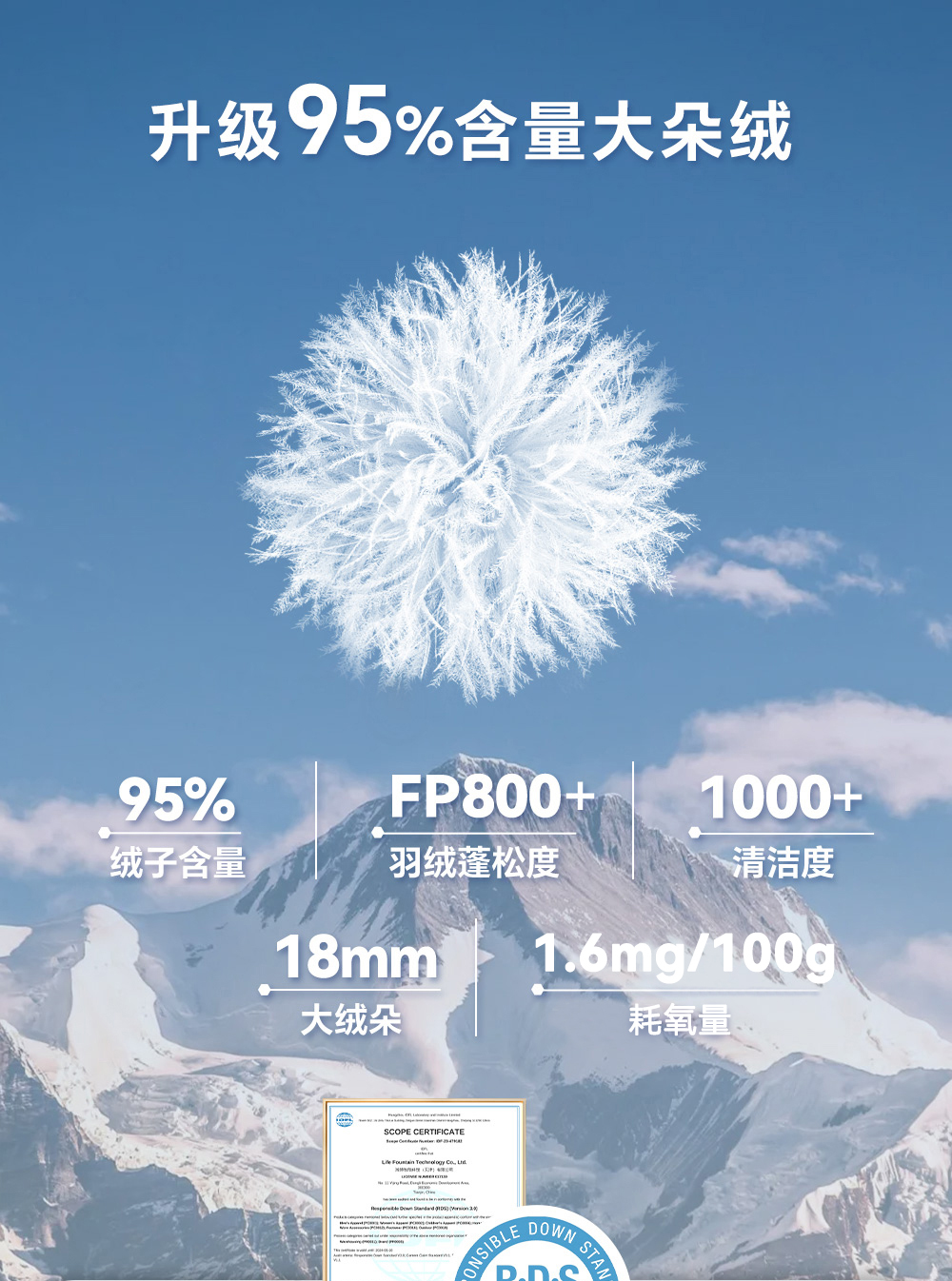 甄选北纬 45°GOLD 羽绒带的匈牙利进口白鹅绒,通过RDS 责任羽绒认证,以95% 高绒子含量、800 + 蓬松度、1000 + 清洁度、18mm 大绒朵和1.6mg/100g 低耗氧量的黄金配置,打造 “轻量锁温舱”。
