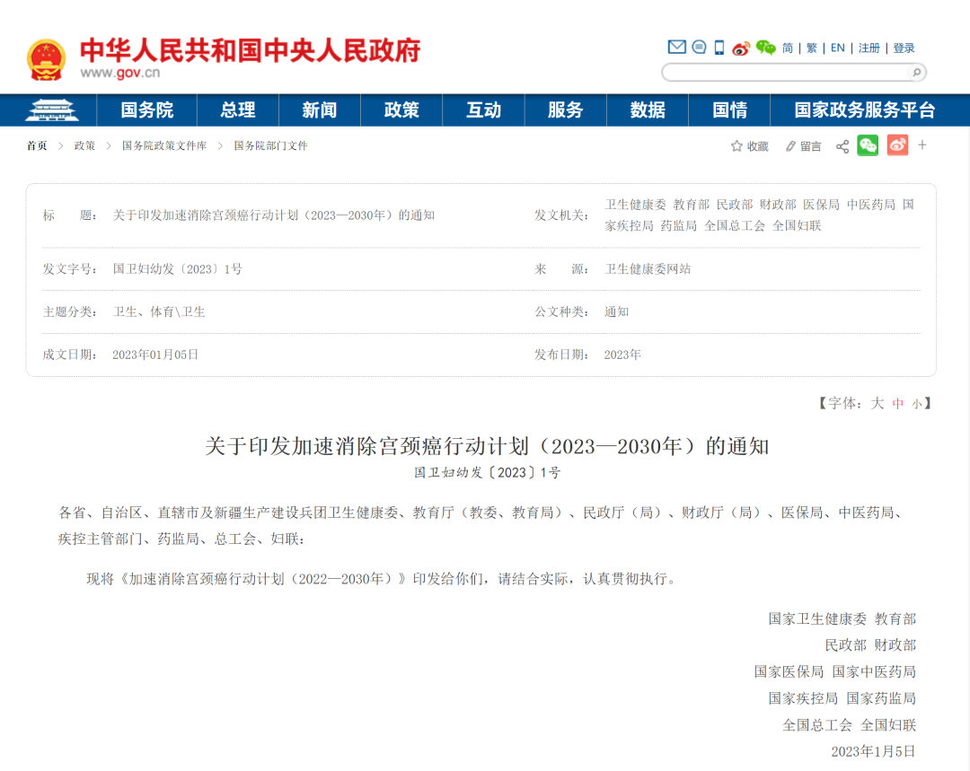近日,国家卫生健康委、教育部、全国妇联等10部门联合印发《加速消除宫颈癌行动计划 (2022-2030年)》,要求进一步完善宫颈癌防治服务体系,提高综合防治能力,构建社会支持环境,努力遏制宫颈癌发病率、死亡率上升趋势,减轻宫颈癌社会疾病负担。通过接种HPV疫苗、筛查、治疗等三级预防措施有效防控并最终实现消除宫颈癌。