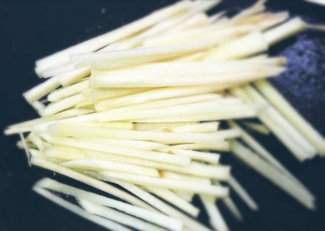 1、猪里脊放入冰箱冷冻半个小时,取出后切成筷子圆头粗细的丝;