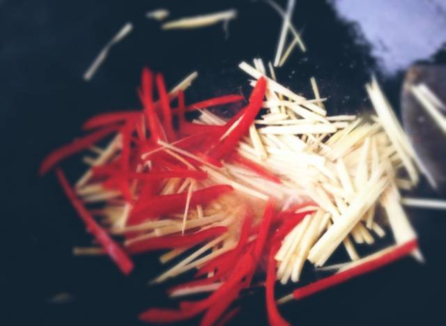 3、锅中留底油,姜丝入锅翻炒,香气升腾,把一半葱丝下锅,两种香气融合,肉丝回锅;