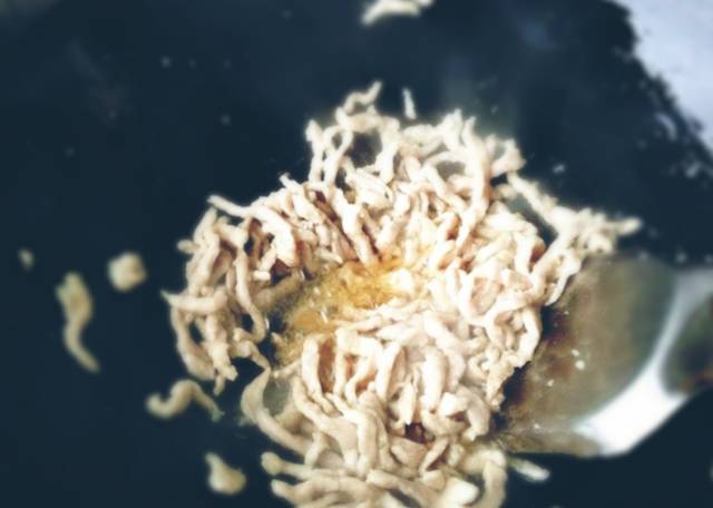 2、关火,肉丝入锅,迅速划散,开火,翻炒至肉丝变白,捞出备用;