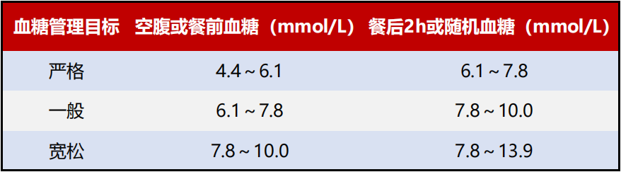 ③存在严重合并症或低血糖风险高的糖友,可将血糖控制目标放宽到10.0~13.9 mmol/L。