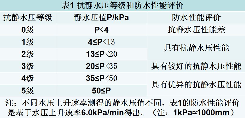 数据来自:GB/T4744-2013《纺织品 防水性能的检测和评价 静水压法》