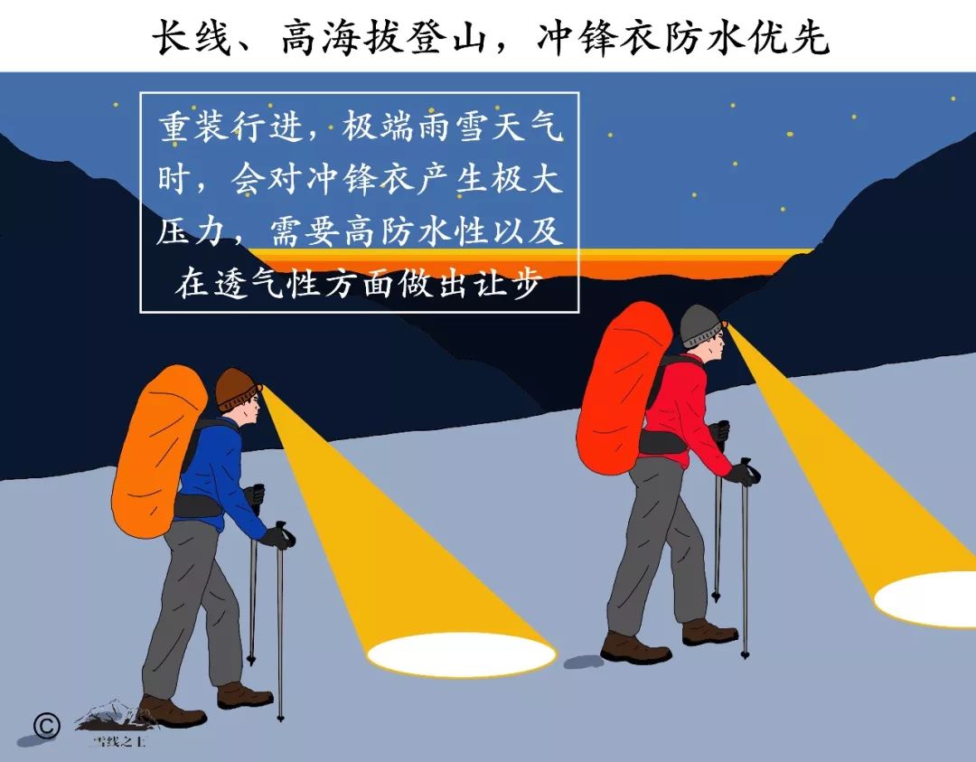 冲锋衣的防水性与透气性不可兼得,你在选购时,就不能指望买一件“全能型”冲锋衣,而应该根据自己的户外活动类型来平衡。
