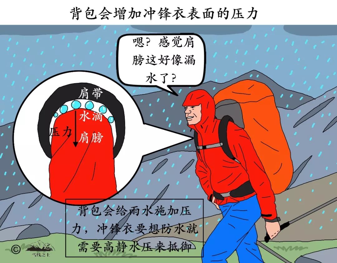 在下雨天背包时,背包会给滴在冲锋衣表面的雨滴施加很大的压力,如果静水压低,雨水就会被“压进”面料,而静水压高,则会有效抵御雨水渗入。