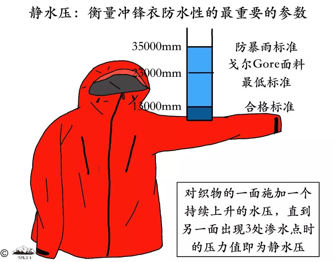 静水压越高,防水性越好——冲锋衣静水压越高,表示抵抗被水渗透的能力越强,也就说明防水性越好。具体数据如下: