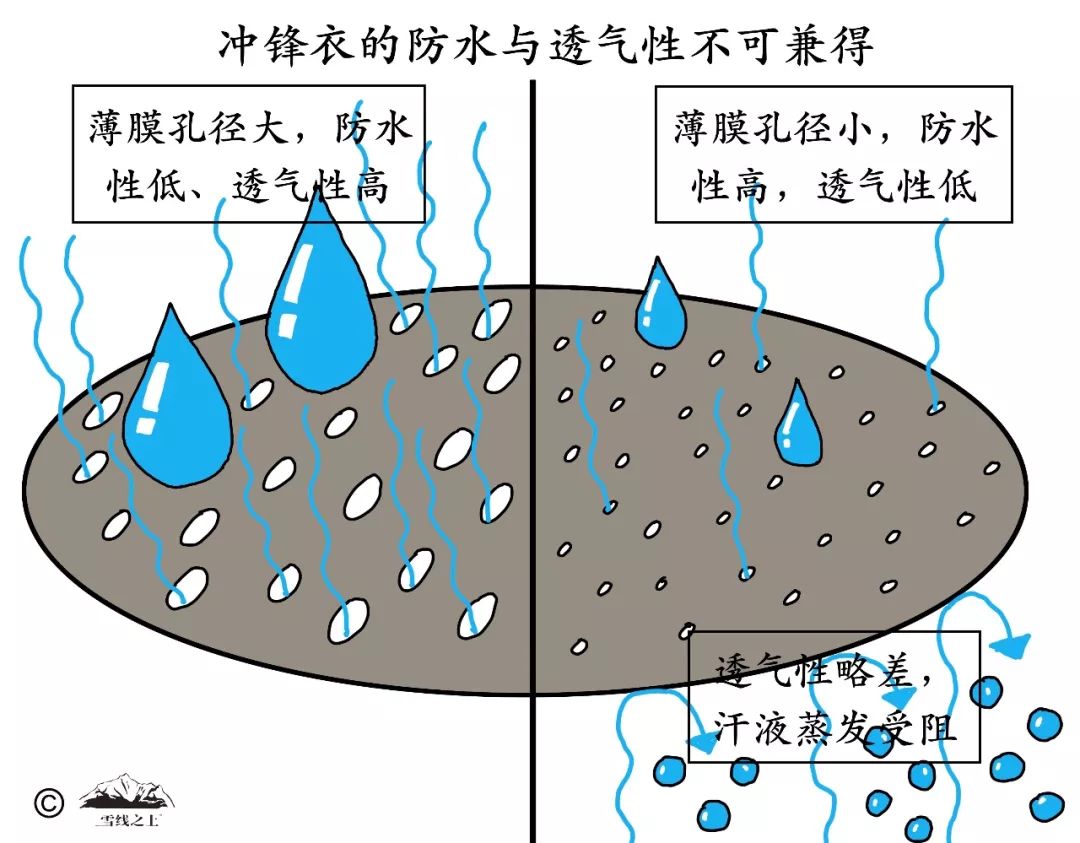 防水性越高,透气性越弱——这是因为冲锋衣的防水和透气都是利用同一通道——薄膜微孔。