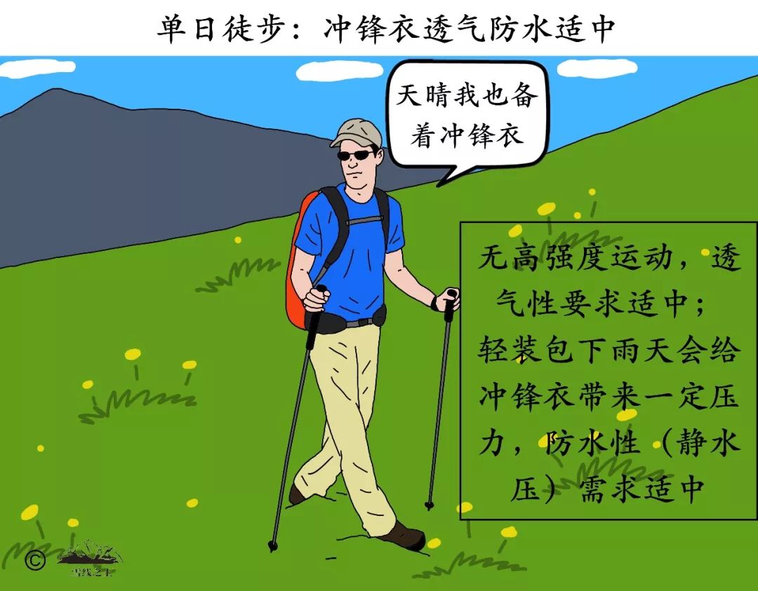 单日徒步——单日徒步运动量适中,冲锋衣无需高强度排汗。