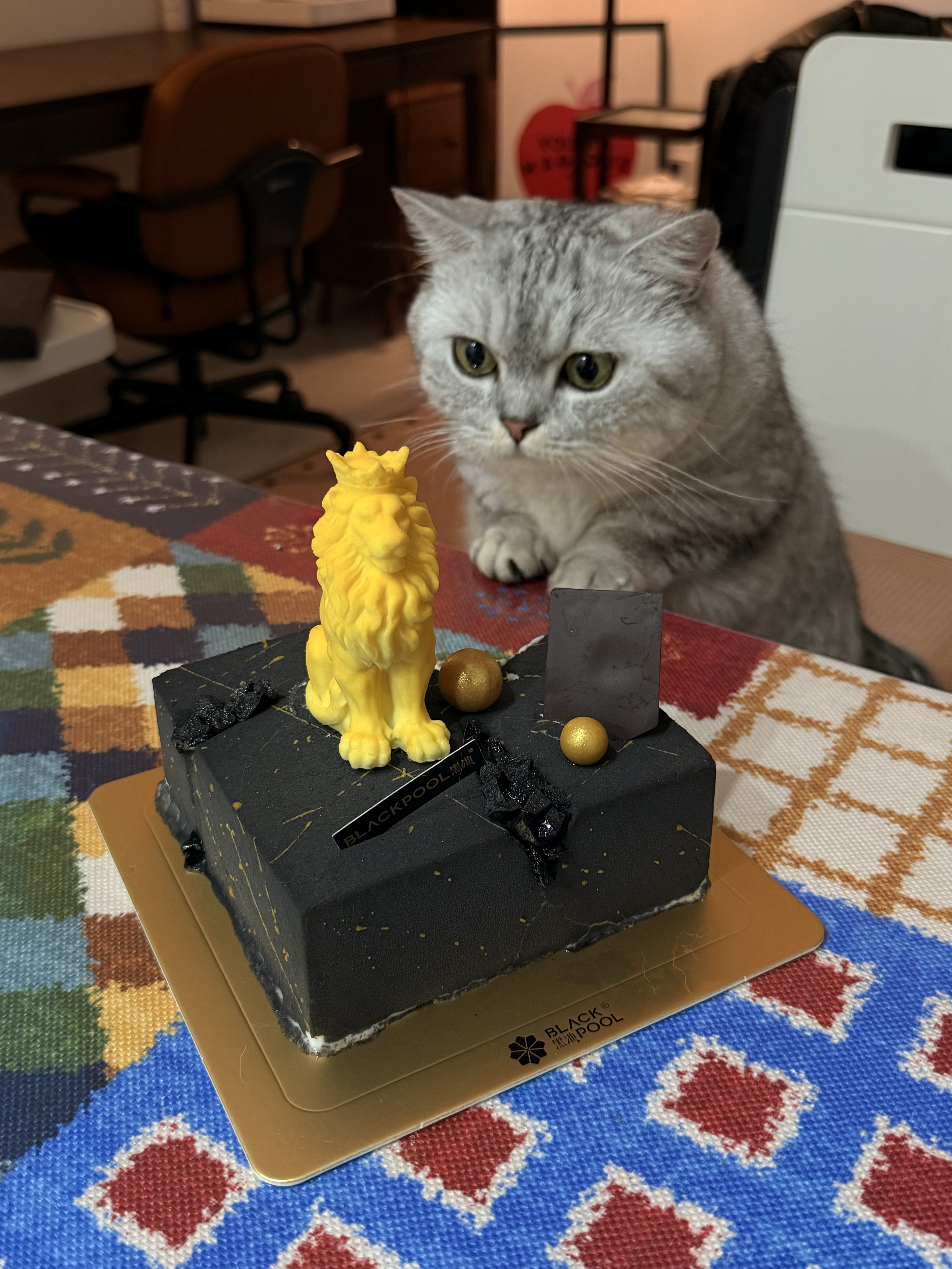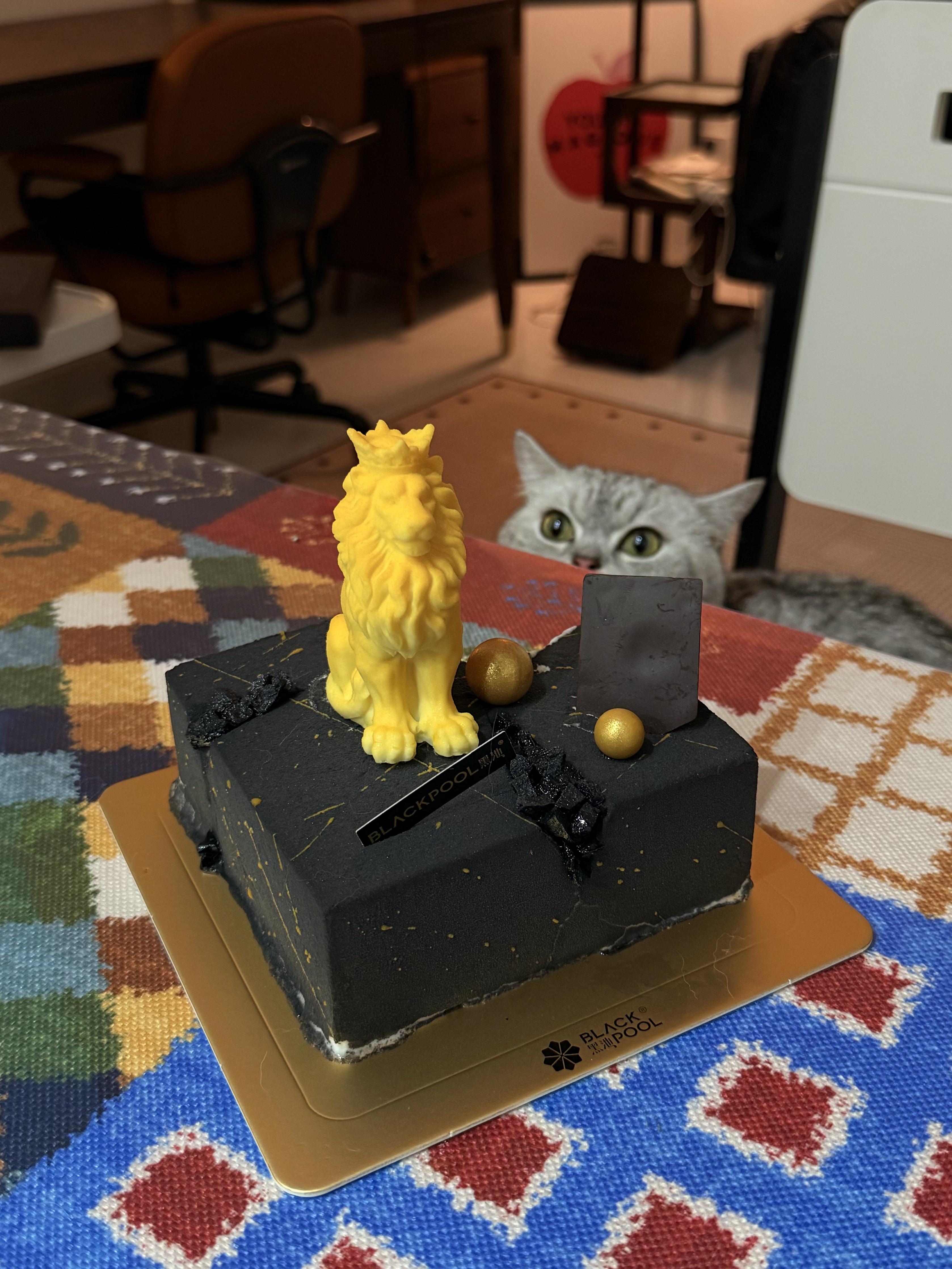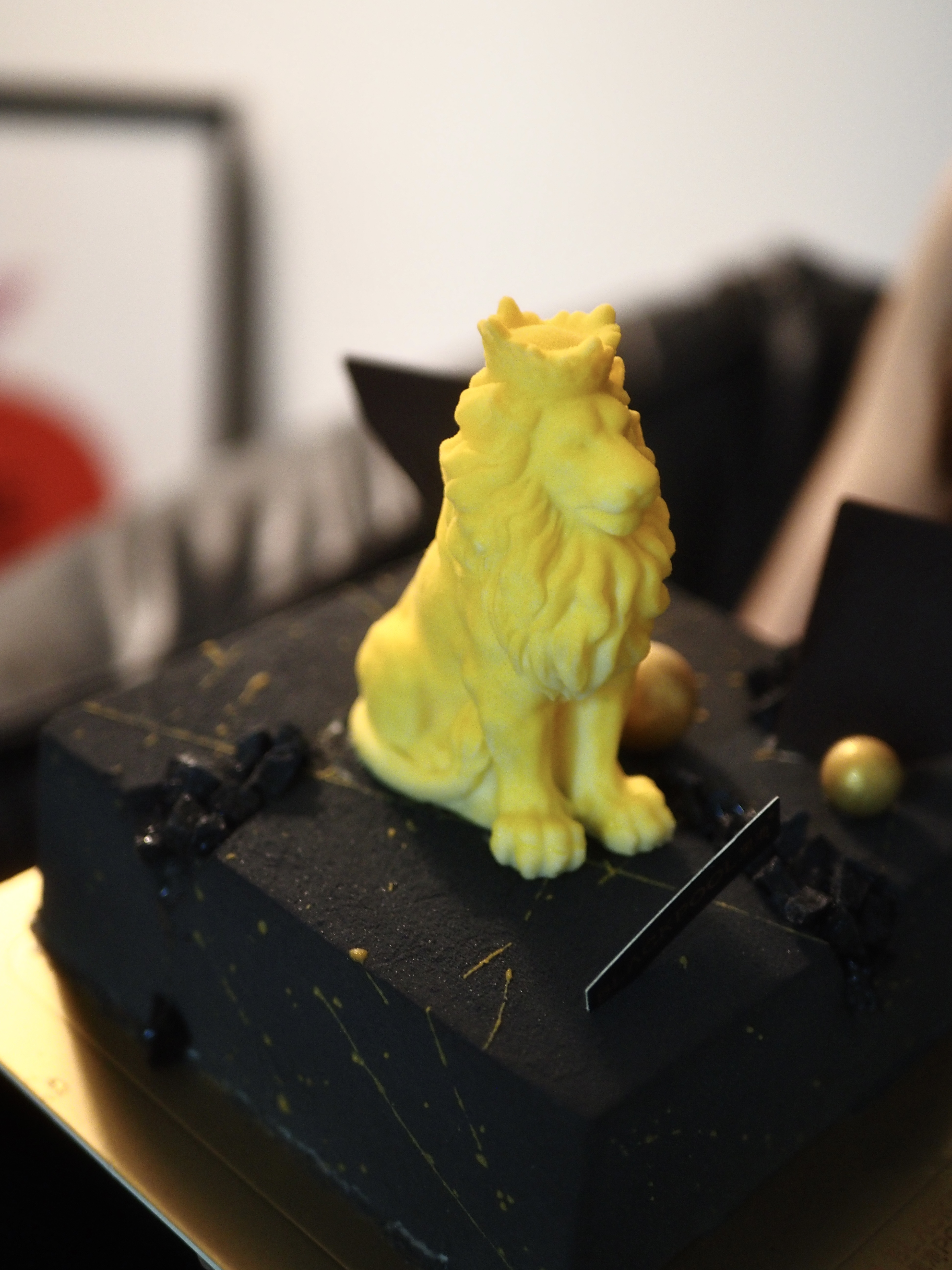 “方正蛋糕胚如鎏金王座,托起一只昂首傲立的雄狮,流转着太阳般的光芒。底座雕刻着星轨纹路,糖霜拉丝如银河倾泻”