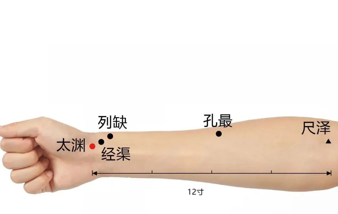 太渊穴位置:在腕掌侧横纹桡侧,桡动脉搏动处或仰掌,当掌后第一横纹上,用手摸有脉搏跳动处的桡侧凹陷者中即是。