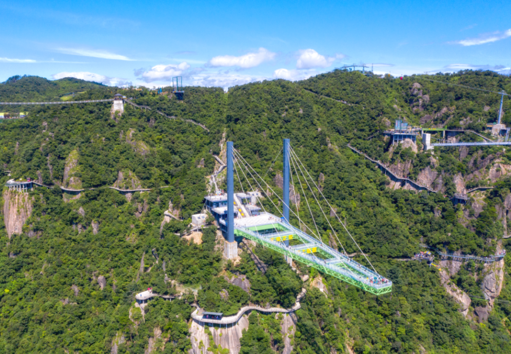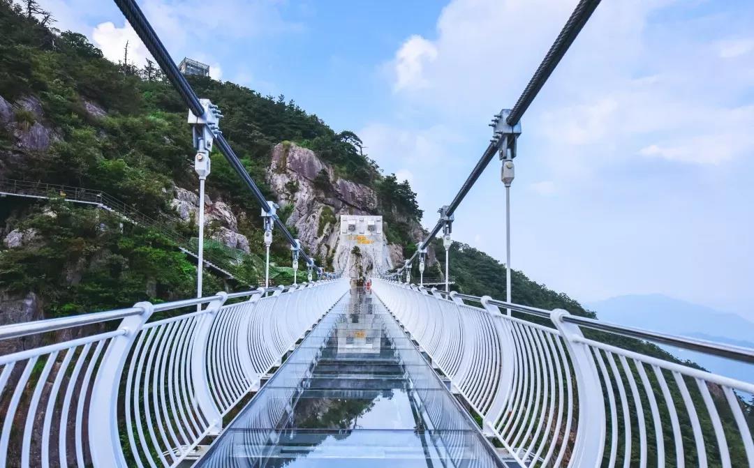 长达82米的全透明玻璃桥,就悬在山间,脚下便是山谷,远眺便是层峦叠嶂,走在上面仿佛漫步于蓝天白云间