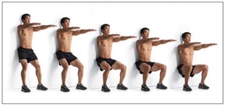 做“靠墙蹲”训练时,背部靠墙,膝盖成直角,对于能力较差的人可以先采用120°左右的角度逐步适应。这个动作对于大腿前侧肌肉的训练非常有效,提升我们上下坡的效率。90秒间歇,5-7组即可。