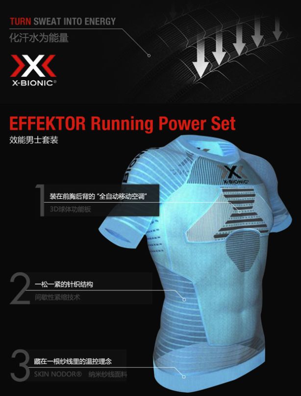 X-Bionic作为瑞士第一运动品牌,拥有军方背景,因此也具备将“仿生学”运用到工业设计的条件,鲨鱼腮部用来透气、银狐热发射功能用来保暖、海狸的皮毛可以防水还有沙袋鼠的恒温技术运用等等。