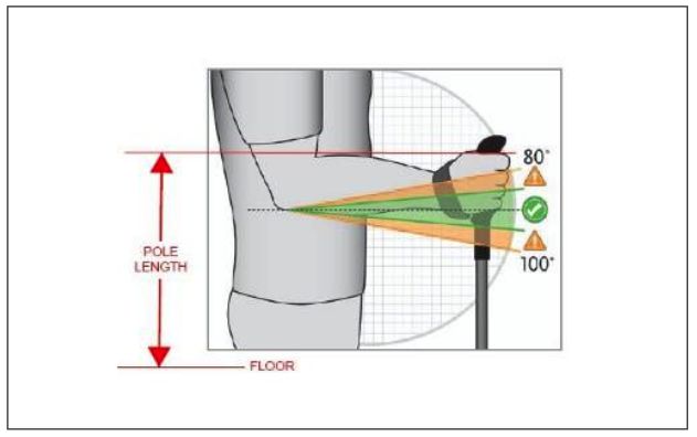 握好手杖后,请勿将手杖的杖尖对着后方,以免伤到其他选手。并将大臂和小臂的角度维持在90度左右。(如下图)