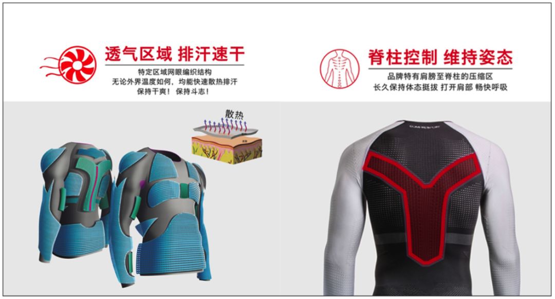 前者主打“根据运动强度随时调解透气量”的“开关衣”;后者则是“将汗水转化为能量”的高端“仿生学压缩衣”。
