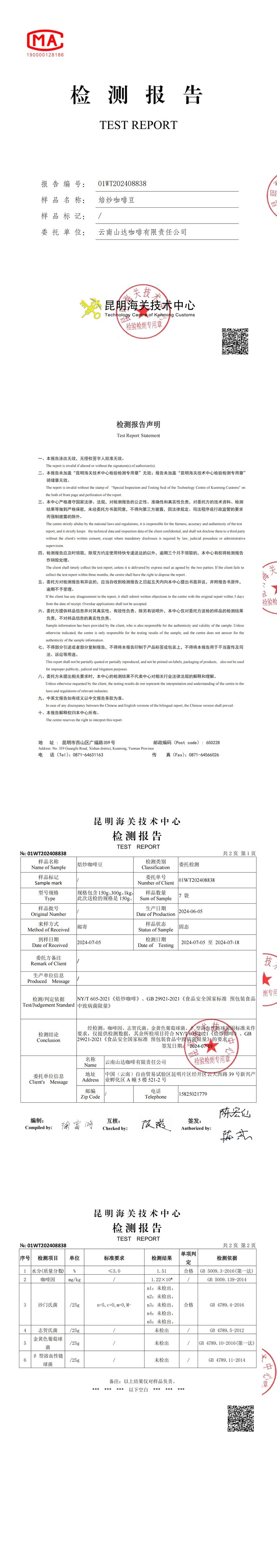 【云南孟连精品咖啡豆】检测报告