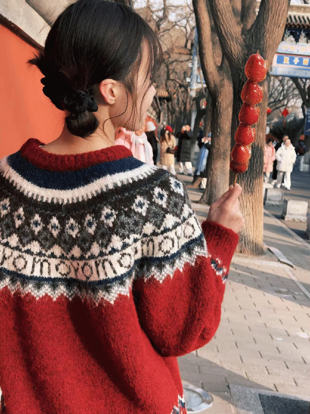 衣身采用局部提花工艺,钩织出茉莉花与北欧风几何图案,营造出浓郁的费尔岛复古气息。