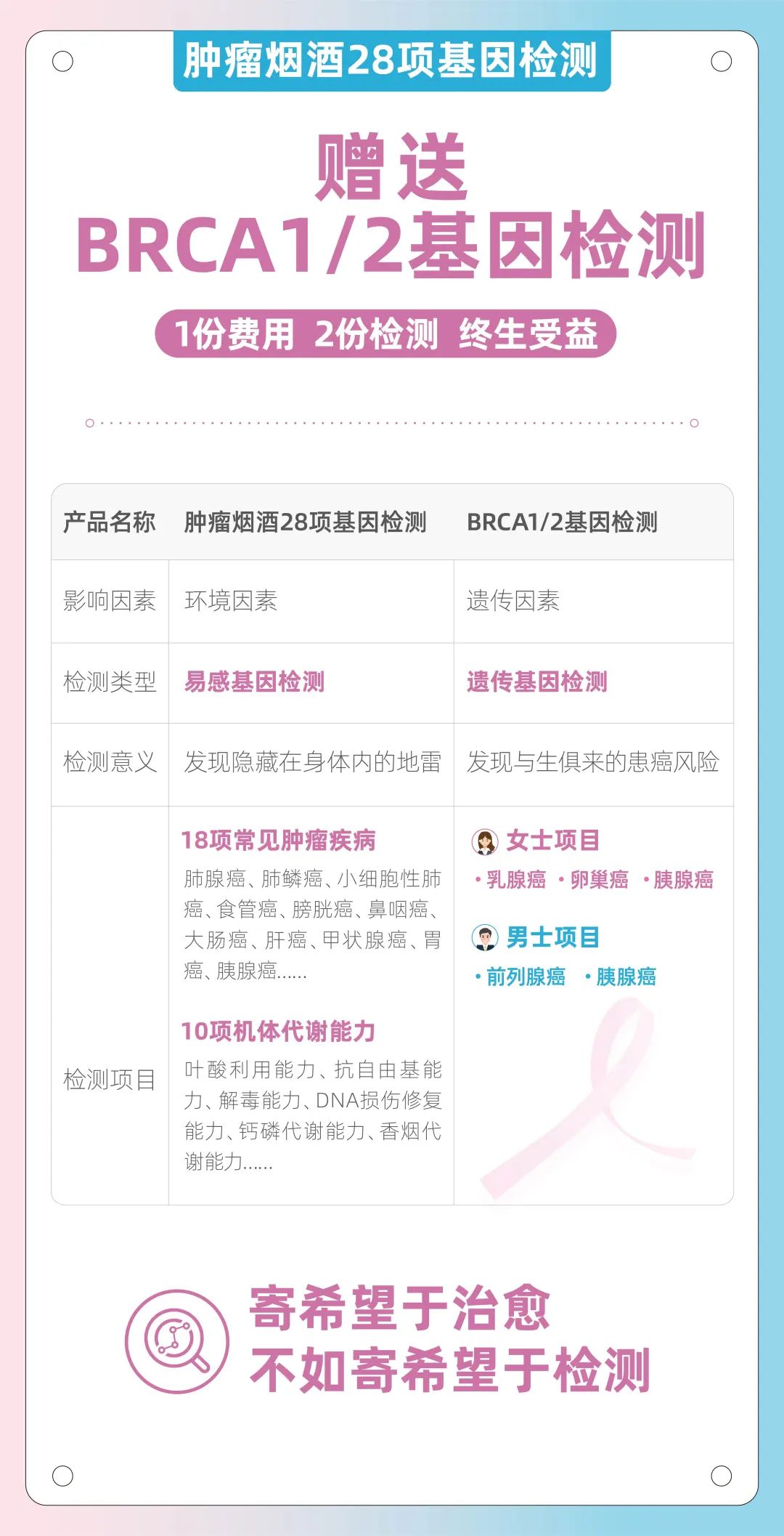 一次性解锁18项常见肿瘤疾病和10项机体代谢能力,除此还额外赠送价值1198元的安吉丽娜·朱莉同款BRCA1/2基因检测项目!