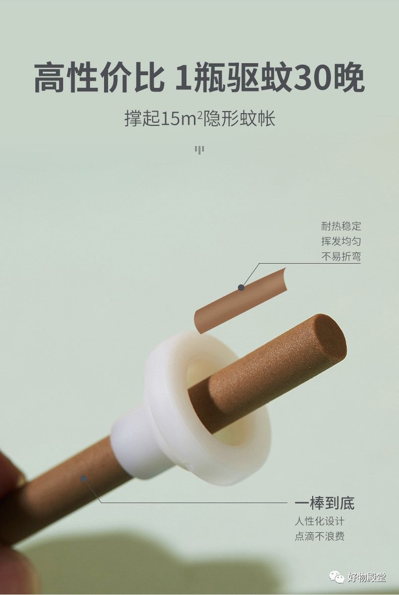 电热蚊香液除了配方之外最重要的就是它的芯棒,是液体蚊香的关键部位,芯棒做的好,能持续均匀的加热释放恒定的驱蚊溶剂,可以连续长时间使用,很适合室内使用。戴可思甄选木纤维芯棒,可以均匀顺畅地倒流药液不浪费。