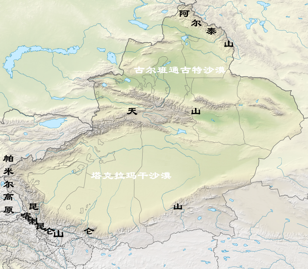 南疆,塔里木盆地。喀喇昆仑、天山、昆仑山等团团包围,暖湿气流难以抵达,年降水量不超过100mm,年蒸发量高达2500~3400mm,“死亡之海”——中国面积最大的沙漠形成了。