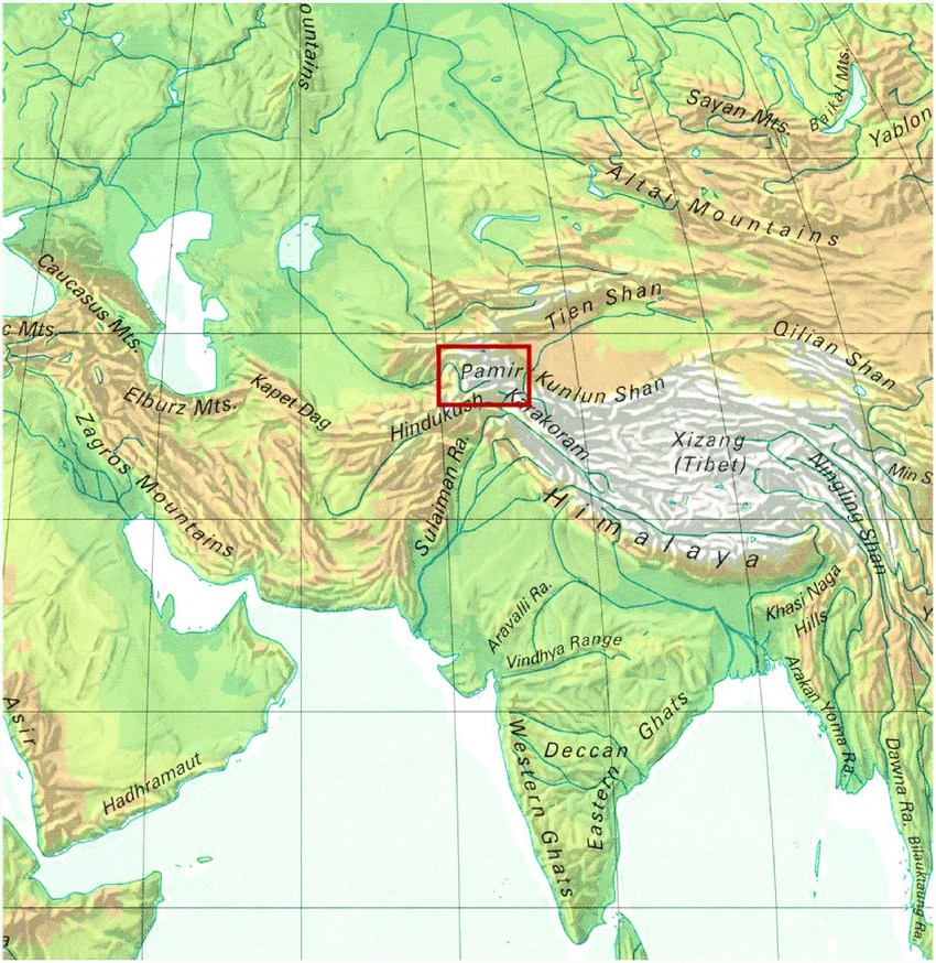从帕米尔高原(红框处)延伸出来的几支高大山脉