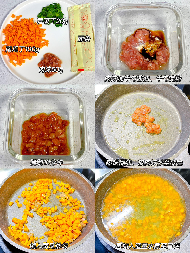 肉沫50g、南瓜丁100g、青菜丁20g、面条