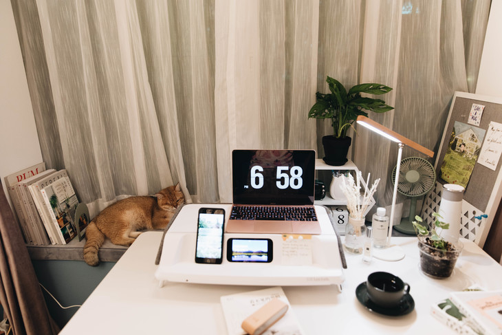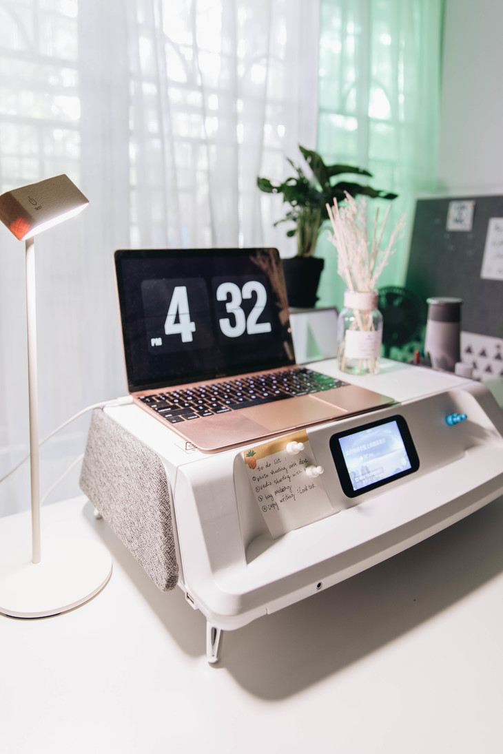 桌面上还有一个增高电脑台,这个太腻害了,可以像抽屉一样收纳我的文具,便条贴之类。还有机器人小助理提醒我今天的任务(当然要提前在app上设定好),还可以通过语音问小助理我的任务是啥,天气之类。另外还竟然有紫外线功能,鼠标键盘手机塞在空隙下面就可以消毒。