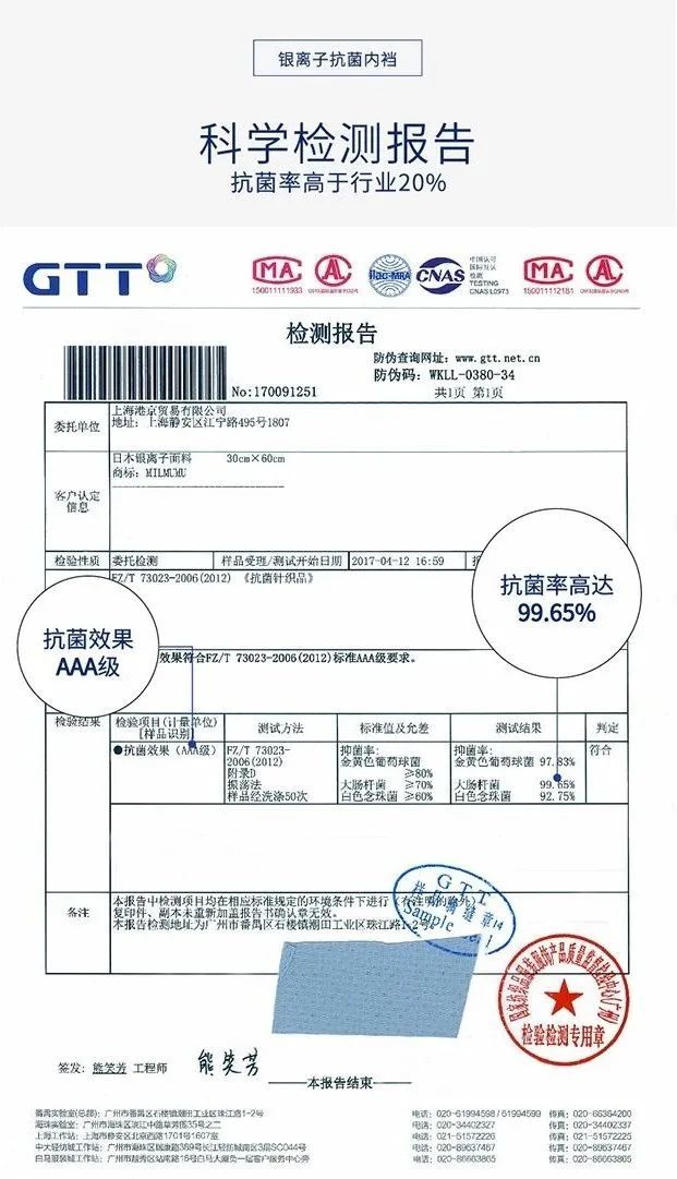 2、裆部采用纳米银离子AAA级抗菌防臭技术,经过专业机构检测,抗菌性到达99%!