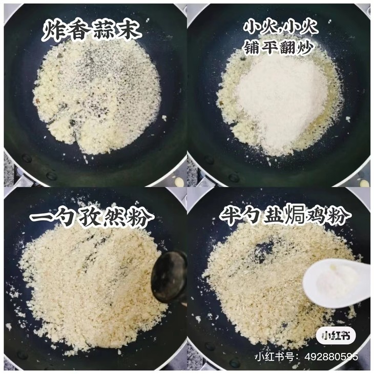 2. 蒜头打成蒜末,热锅下油,炸至金黄,转小火加入面包糠,不停翻炒,让蒜末跟面包糠完美结合,加一勺孜然粉或椒盐粉,搅拌捞起均匀备用