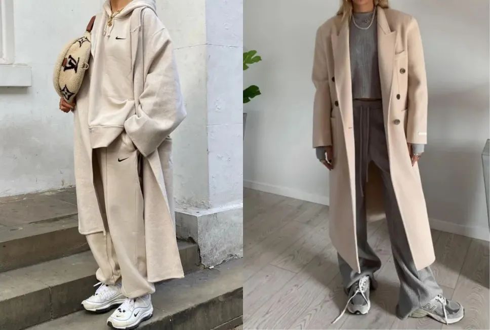 今年很流行的穿法,大衣里内搭运动套装,驼色的大衣绝对是首选!