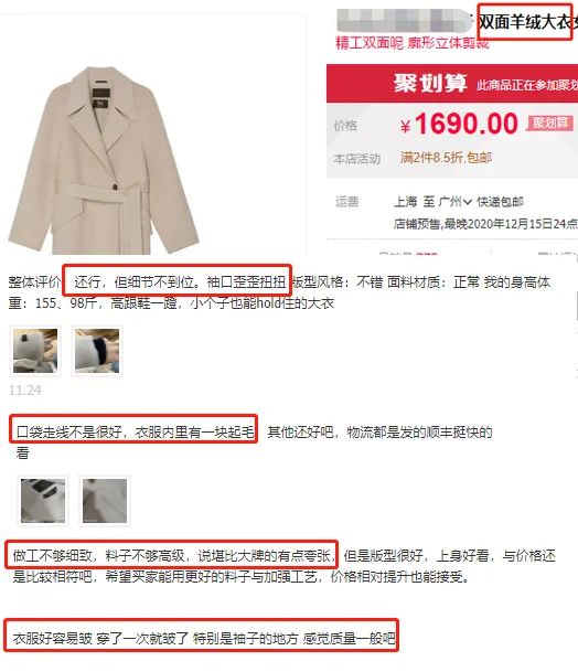这样的大衣,即使标的含量再高,上身的感觉像是披着一块地毯在身上,质感也不好。