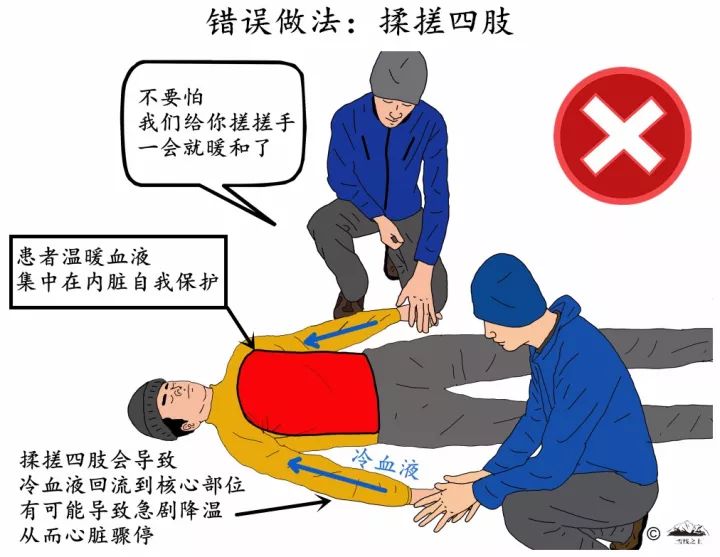 首先,摩擦在患者有冻伤的情况下会造成二次伤害;其次,四肢温度升高会导致冷血回流冲击心脏。