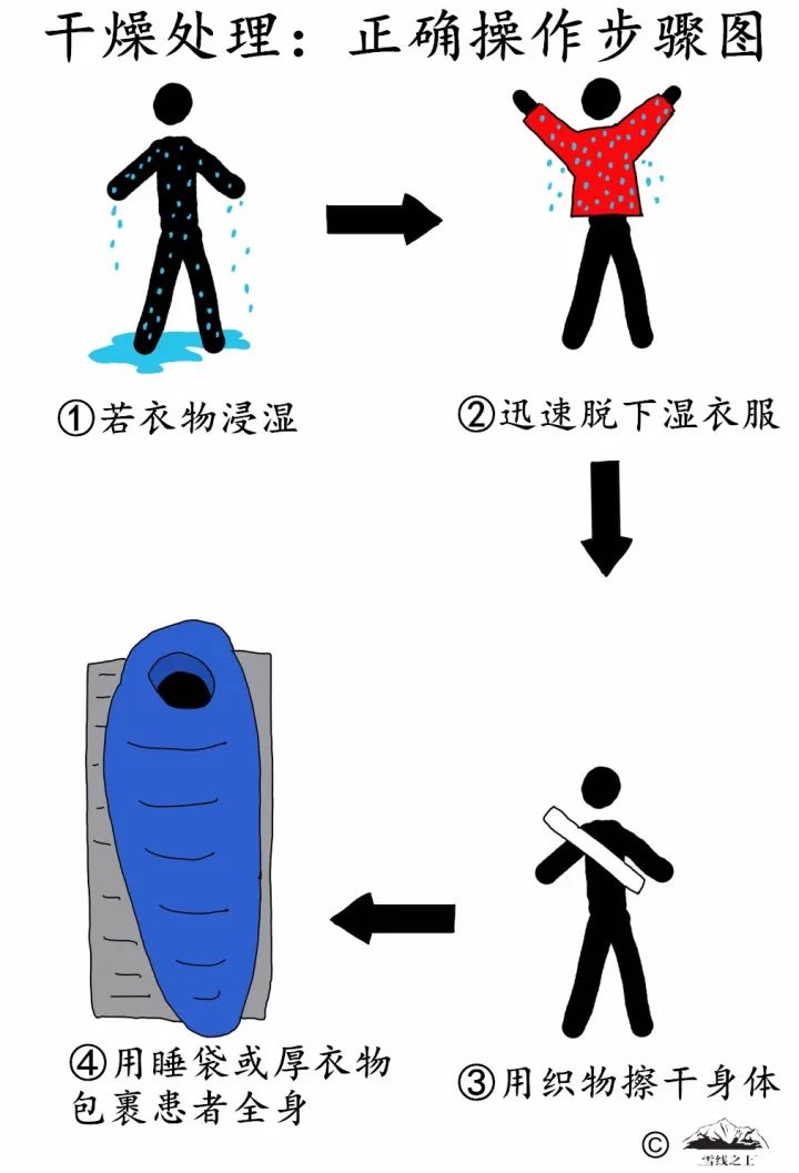 无论患者穿了多少层衣服,只要被浸湿,都应迅速将湿掉的衣服全部脱下,用织物擦干患者身体,换上干燥衣物,用睡袋或厚衣物将患者全身包裹。