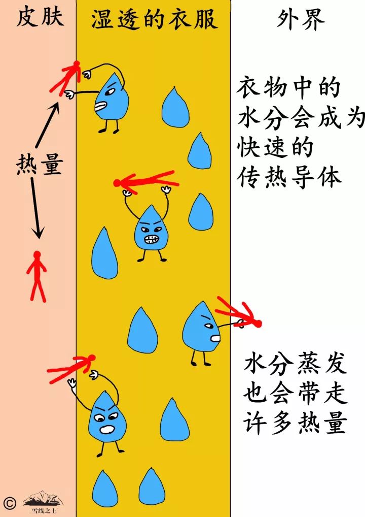 衣物中的水分成为传热导体,同时水分的蒸发也会带走更多热量。