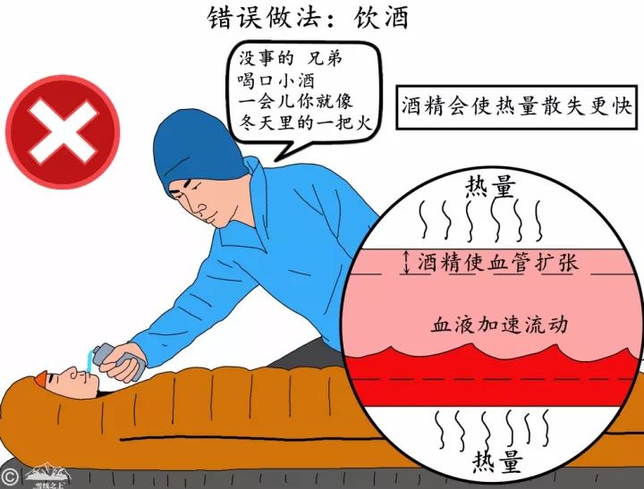 让失温患者饮酒,是常见的错误做法。喝酒的确会有一种“暖和”的假象,但是随后会加快热量流失。