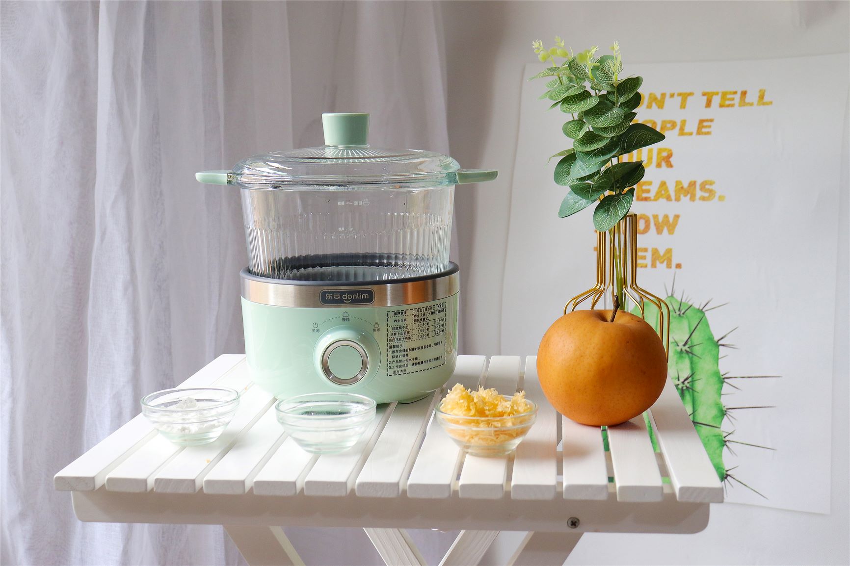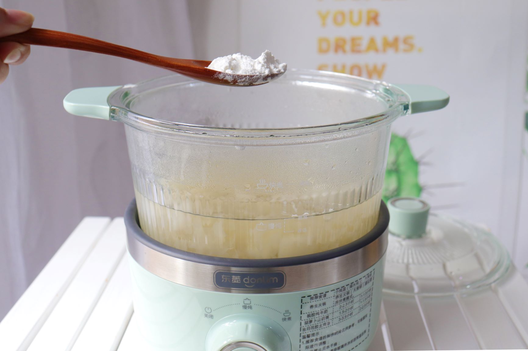4. 把梨、银耳放入锅中,倒入清水,开启慢炖模式。这里我用的是东菱养生锅采用旋钮式操作,一键旋转灵活切换快煮/慢炖模式,小白式操作轻松无难度