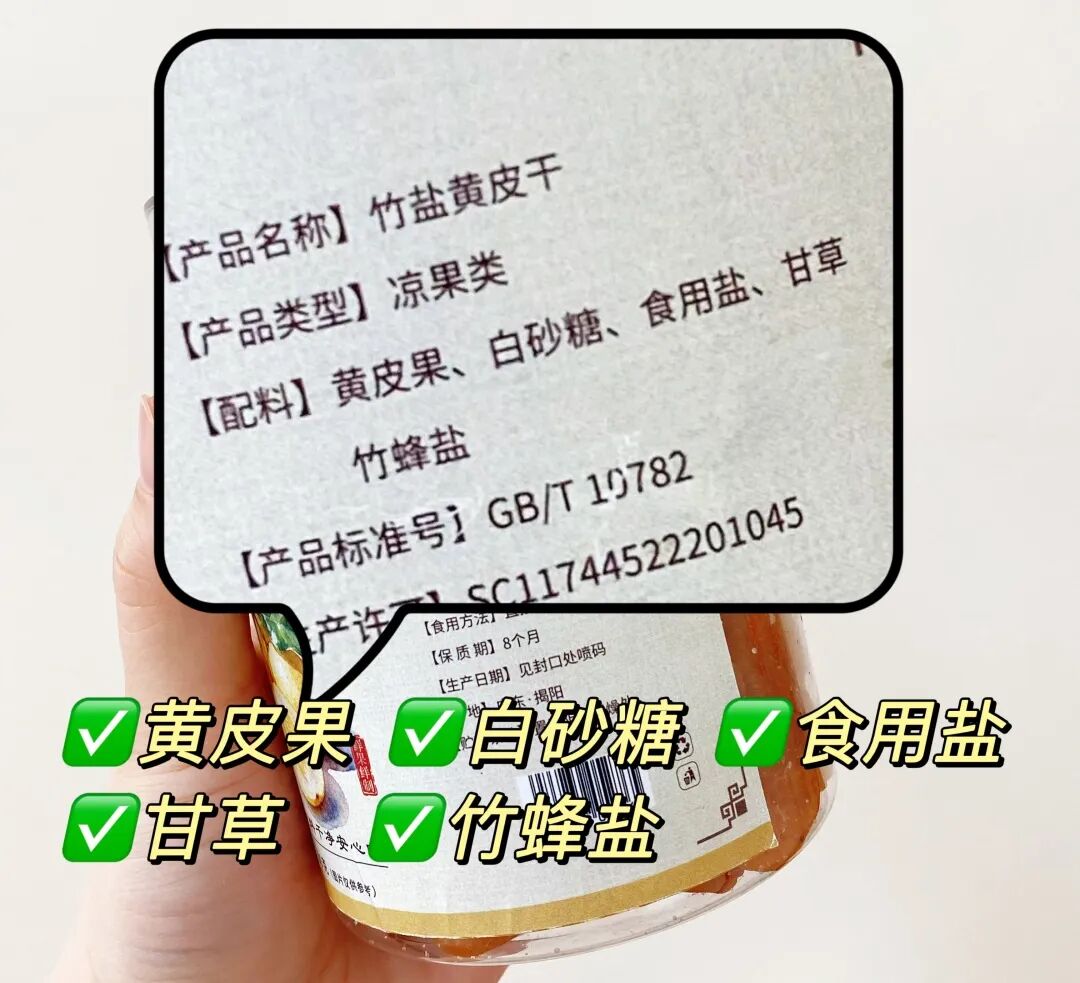 这款竹盐黄皮干配料表:黄皮果、白砂糖、食用盐、甘草、竹蜂盐