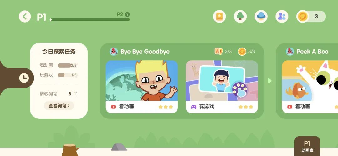 假如是完全没有接触过英文的零基础孩子,那么就从P1级别开始,比如这一天系统给自动推荐了3集0基础的SSS儿歌,分别是Bye Bye Goodbye、Peek A Boo和I See Something Pink。